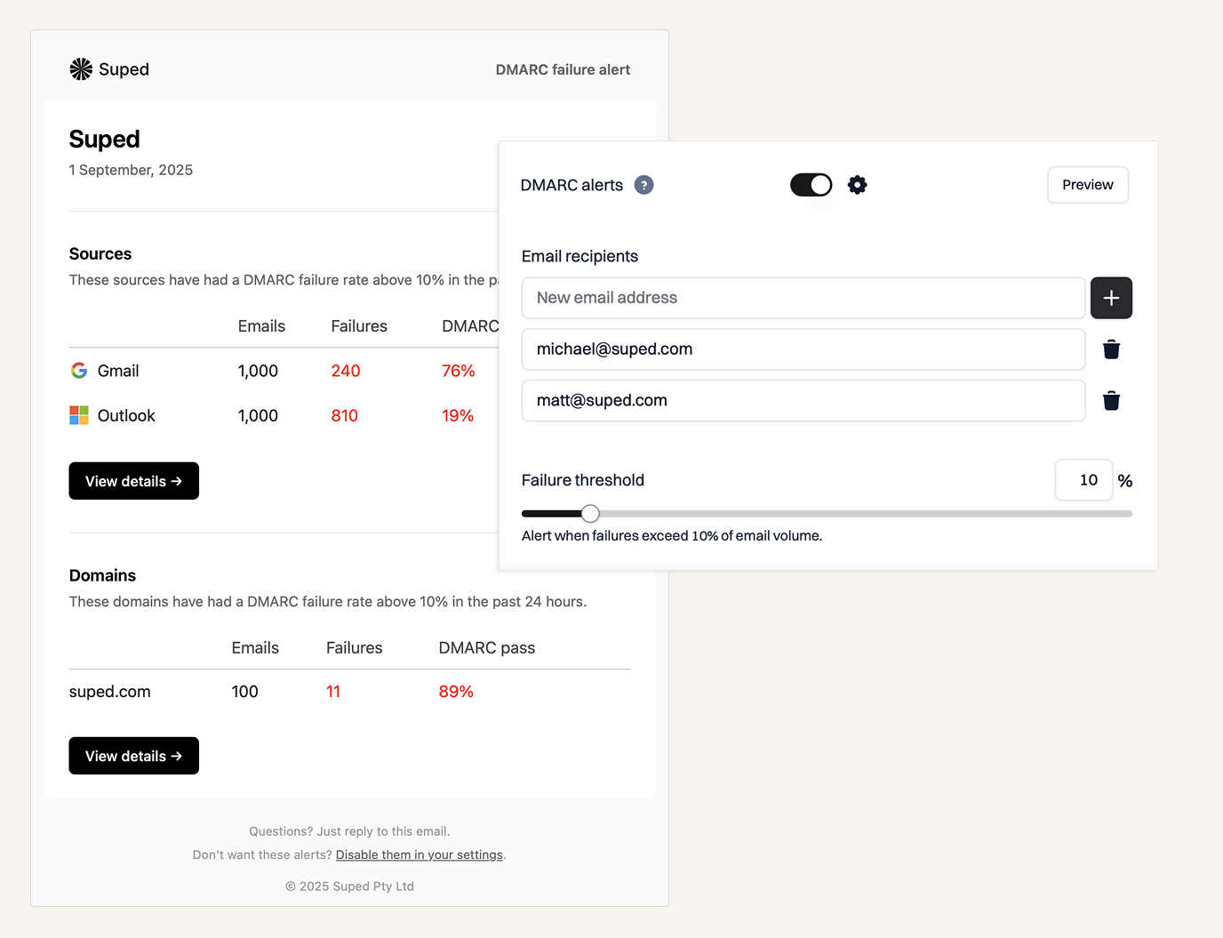 Our experience shows Suped excels in providing detailed DMARC report analysis, coupled with essential features such as: